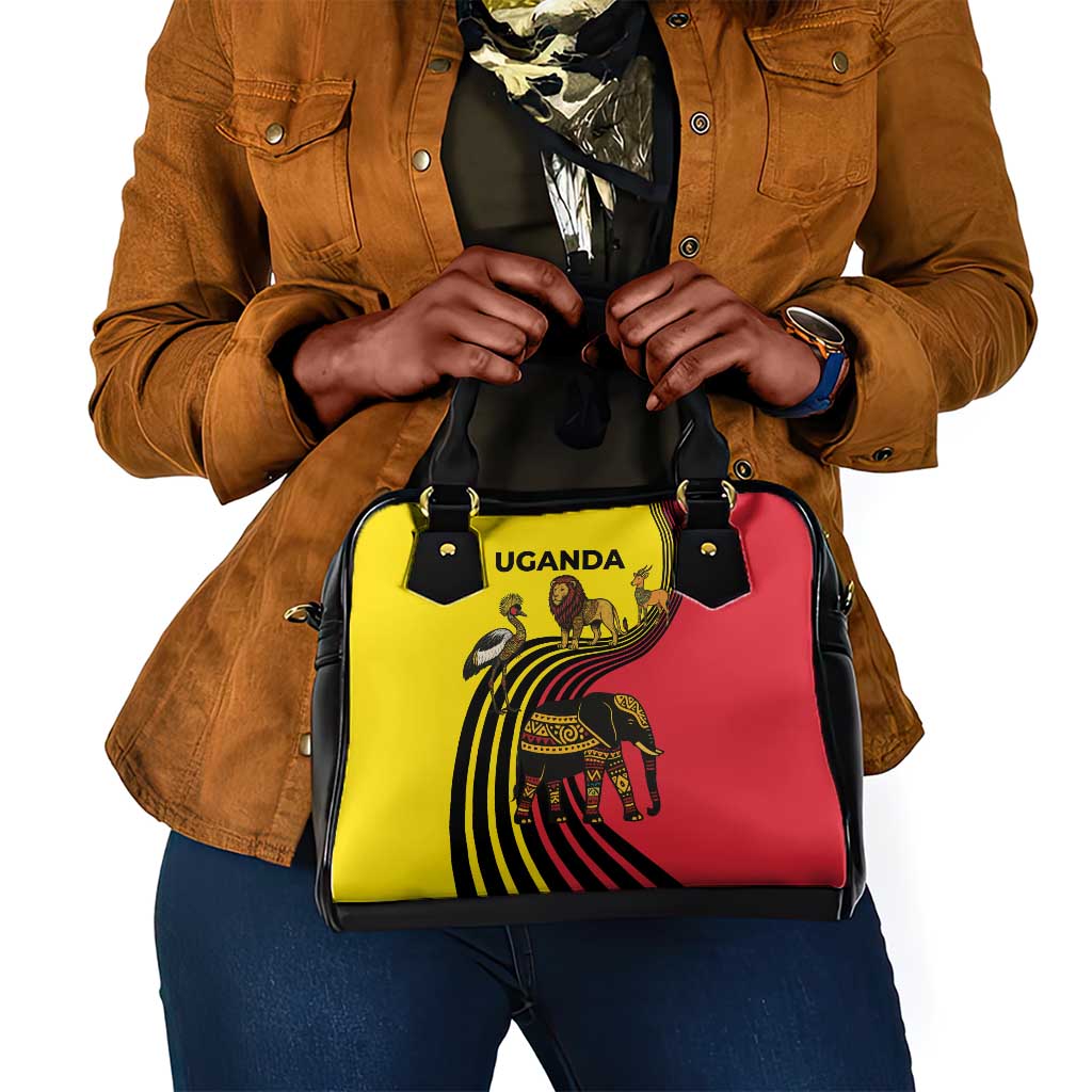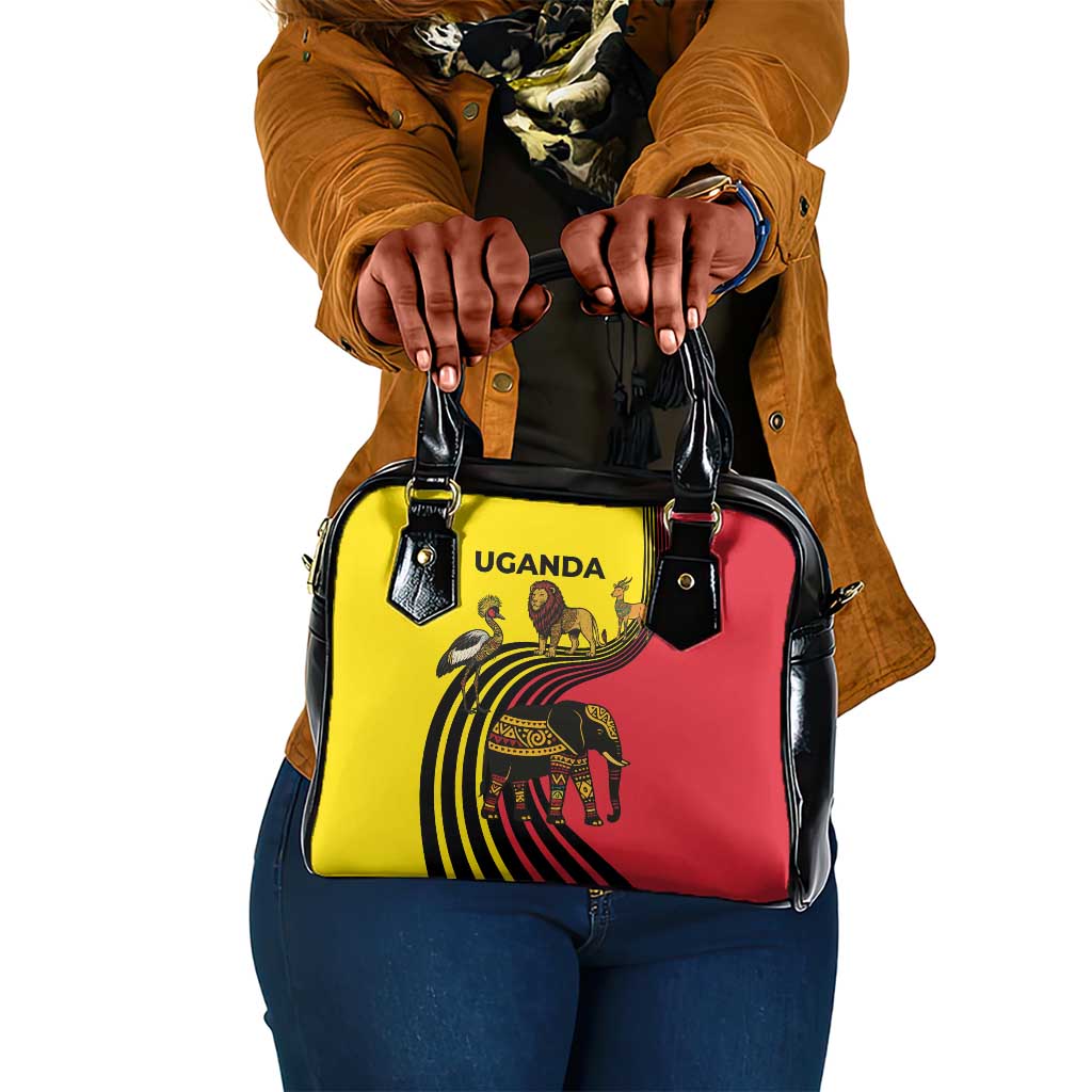 Uganda Shoulder Handbag African Wildlife Elephant Lion And Crane In Tribal Pattern Design