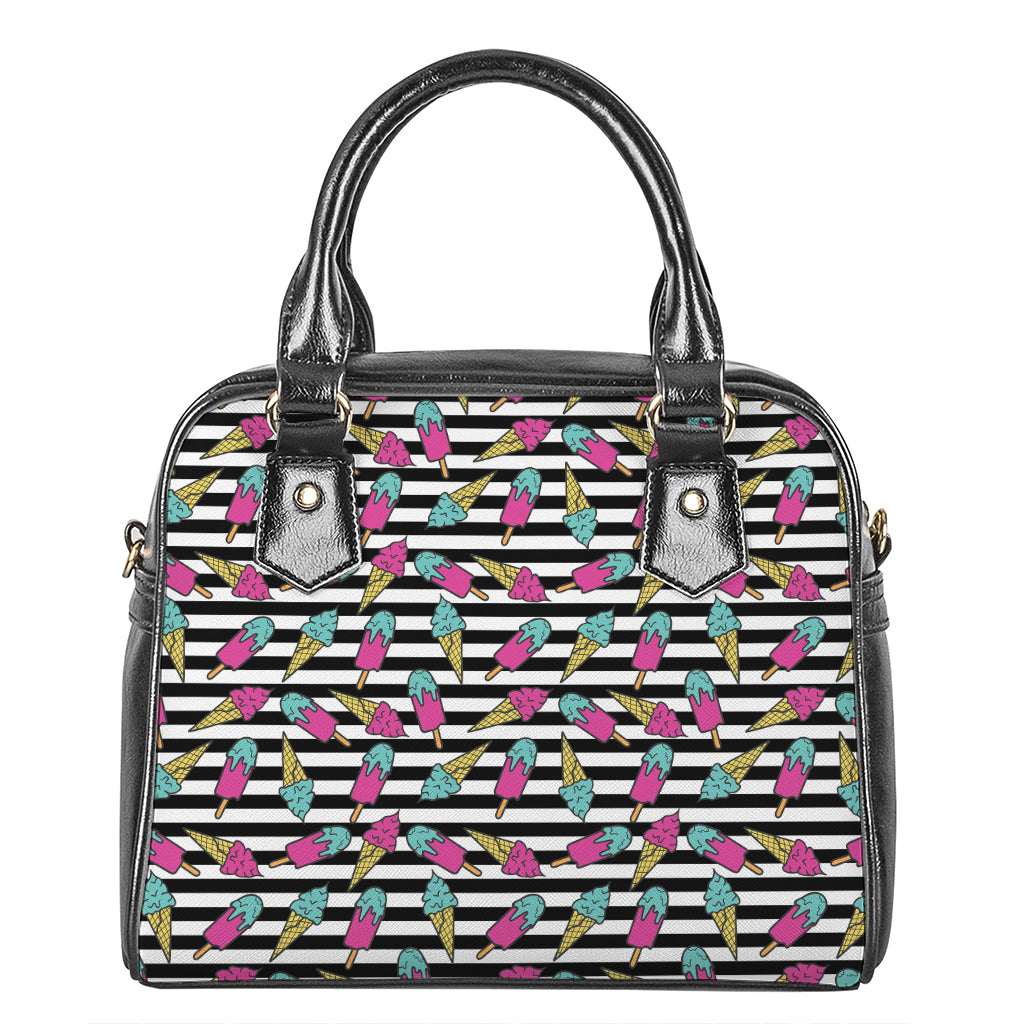 Black Striped Ice Cream Pattern Print Shoulder Handbag