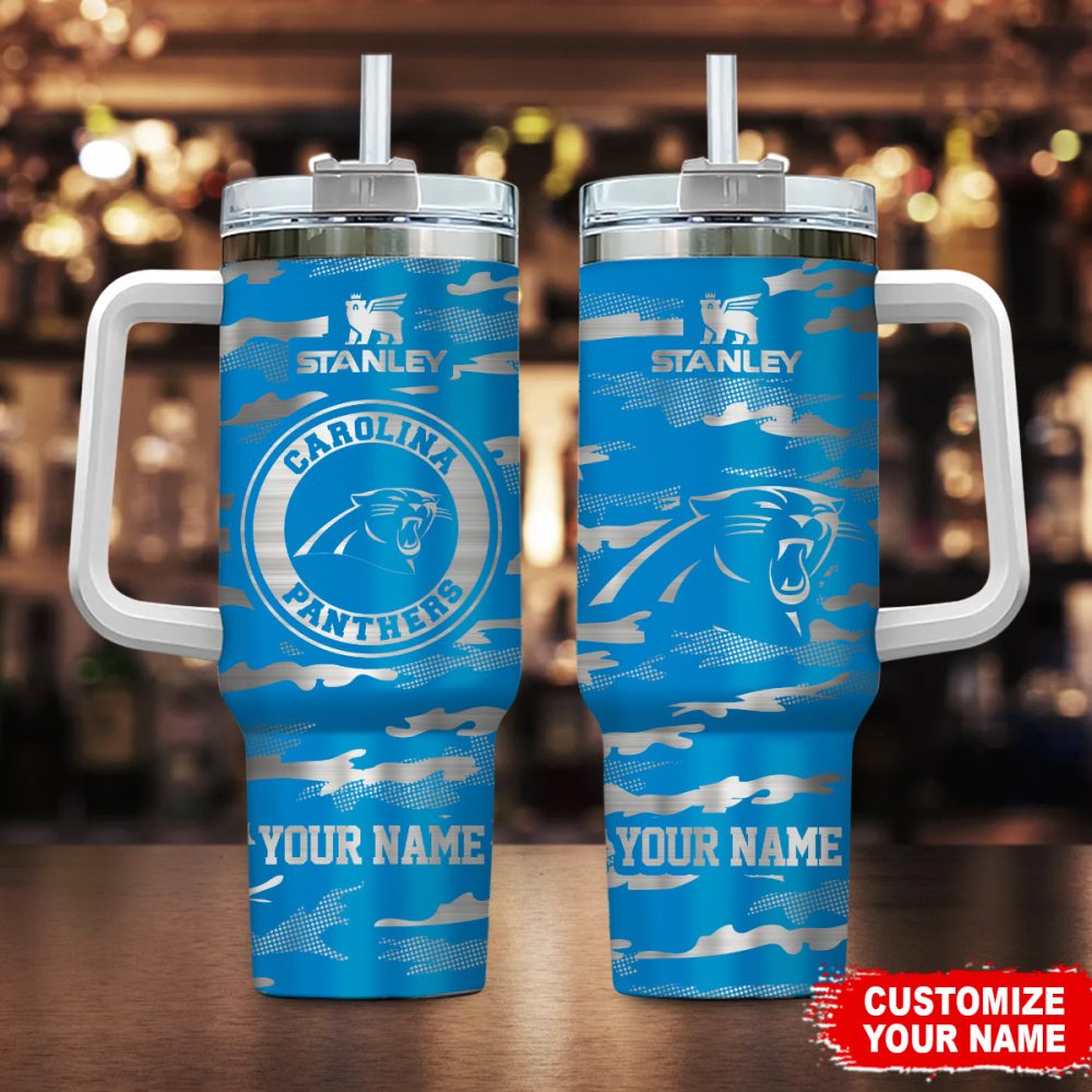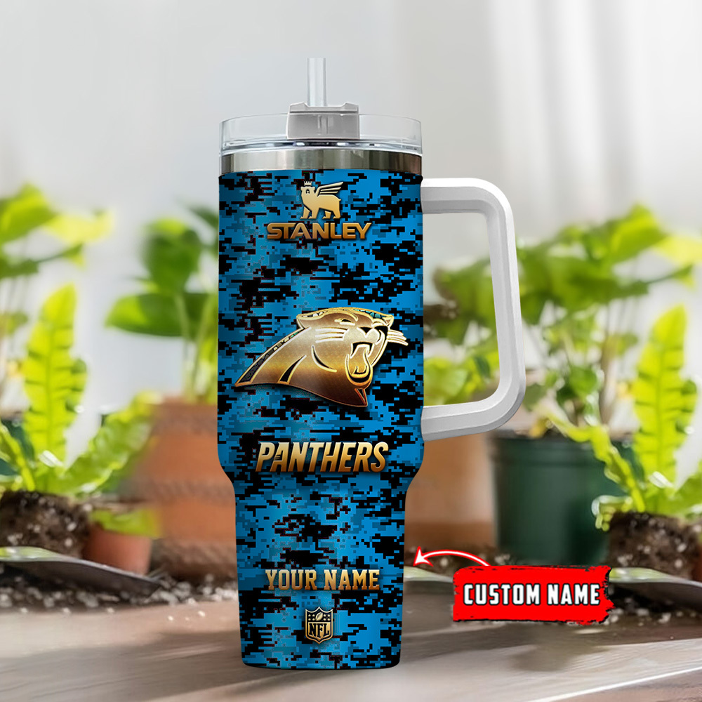 Carolina Panthers Nfl Camo Pattern Custom Stanley Quencher 40Oz Stainless Steel Tumbler With Handle