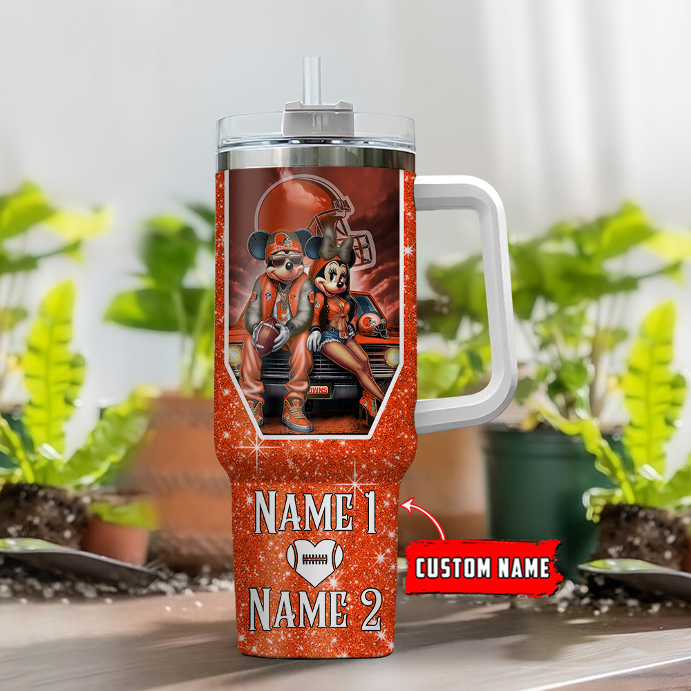 Cleveland Browns Nfl Mickey And Minnie Couple Custom Stanley Quencher 40Oz Stainless Steel Tumbler With Handle
