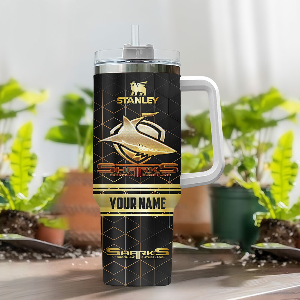 Cronulla-Sutherland Sharks Nrl Golden Logo Custom Stanley Quencher 40Oz Stainless Steel Tumbler With Handle