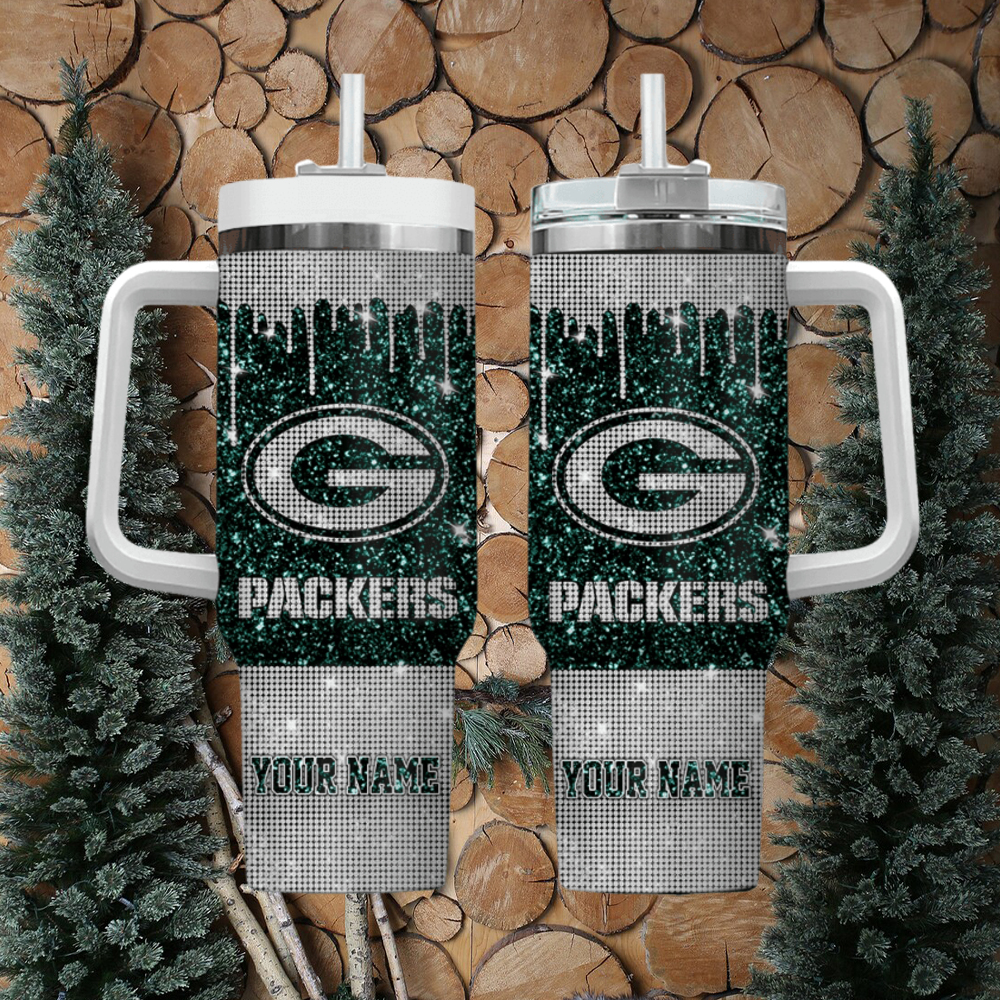 Green Bay Packers Nfl Glitter Custom Stanley Quencher 40Oz Stainless Steel Tumbler With Handle