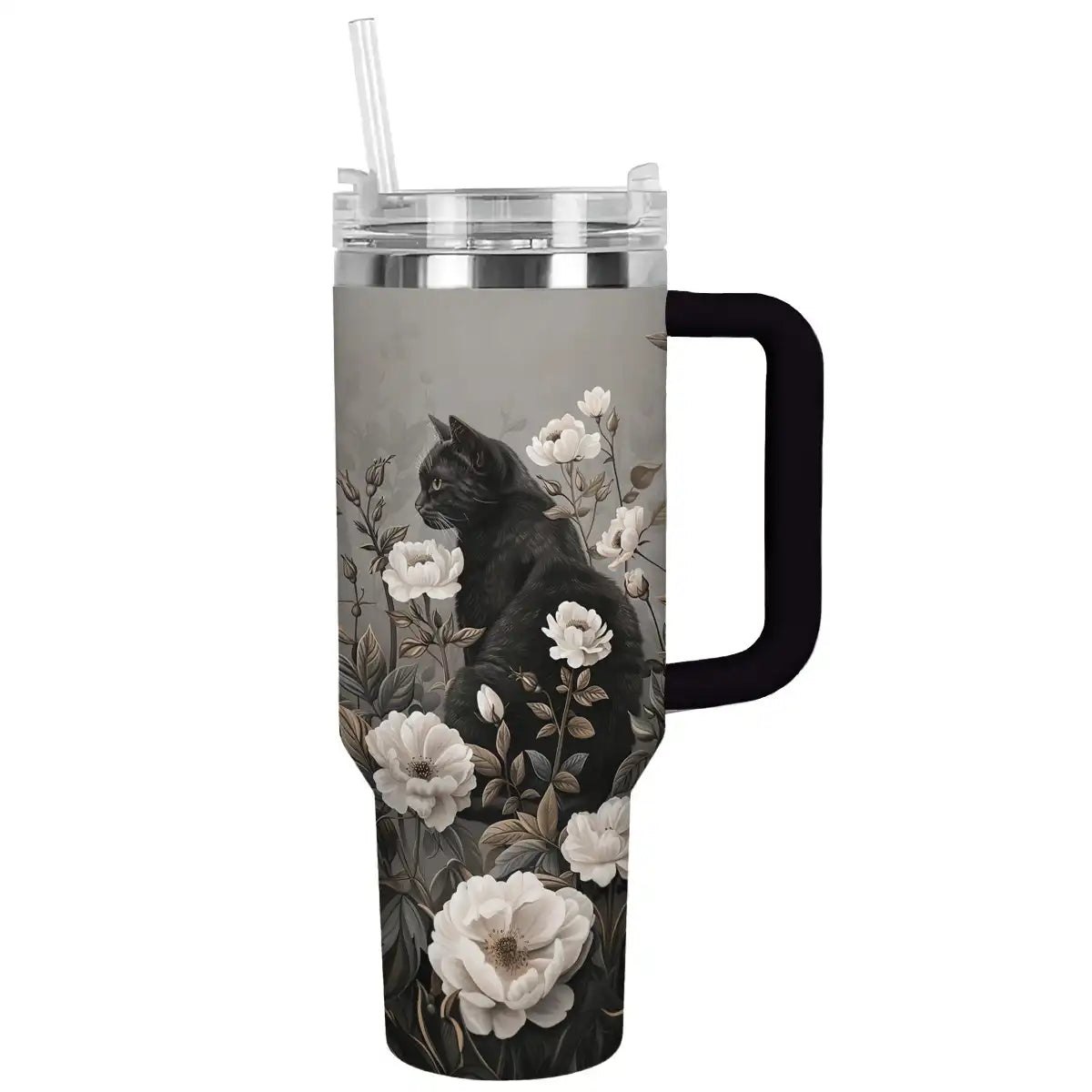 Black Cat Floral Custom Stanley Cup 40 oz Tumbler With Handle