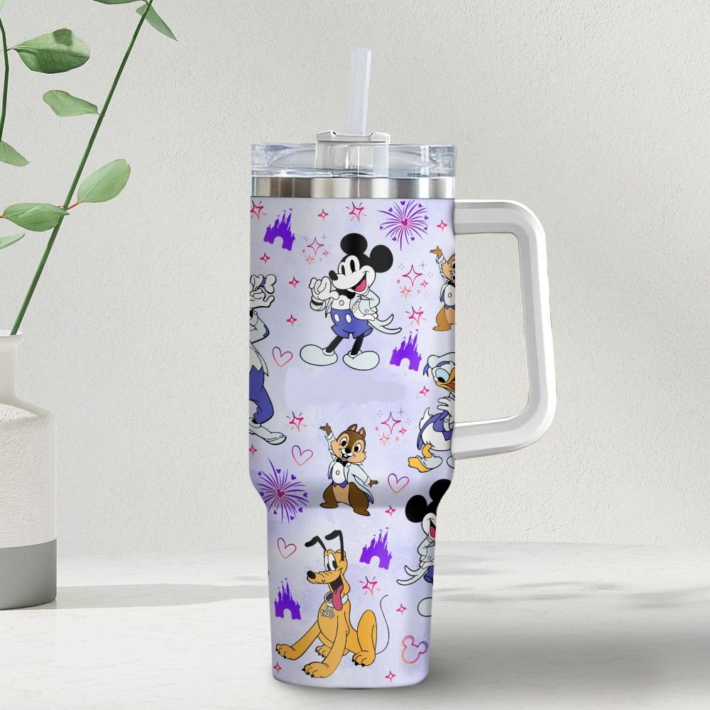 Disney Characters Tumbler With Handle 40Oz Stainless Steel Insulated Cup With Straw Mickey Donald And Friends Design