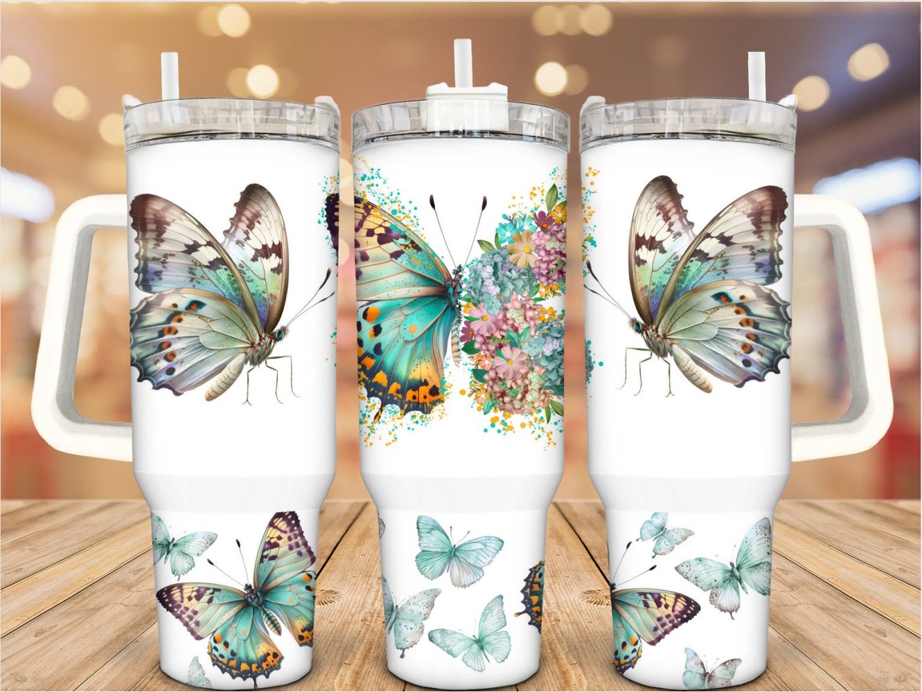 Floral Butterfly Custom Stanley Quencher 40Oz Stainless Steel Tumbler With Handle