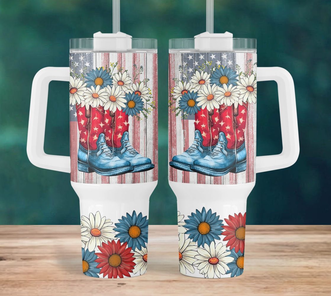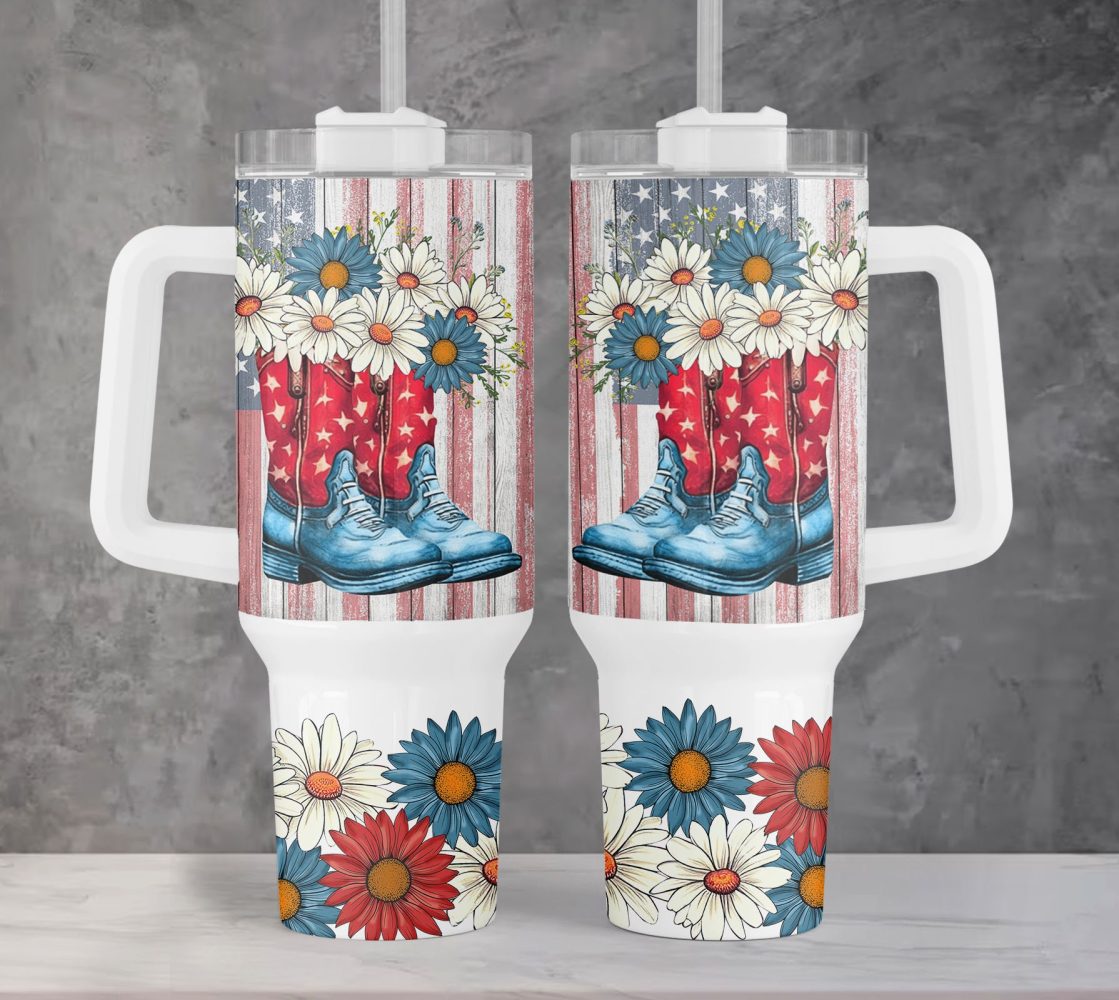 Floral Patriotic American Boots Custom Stanley Quencher 40Oz Stainless Steel Tumbler With Handle