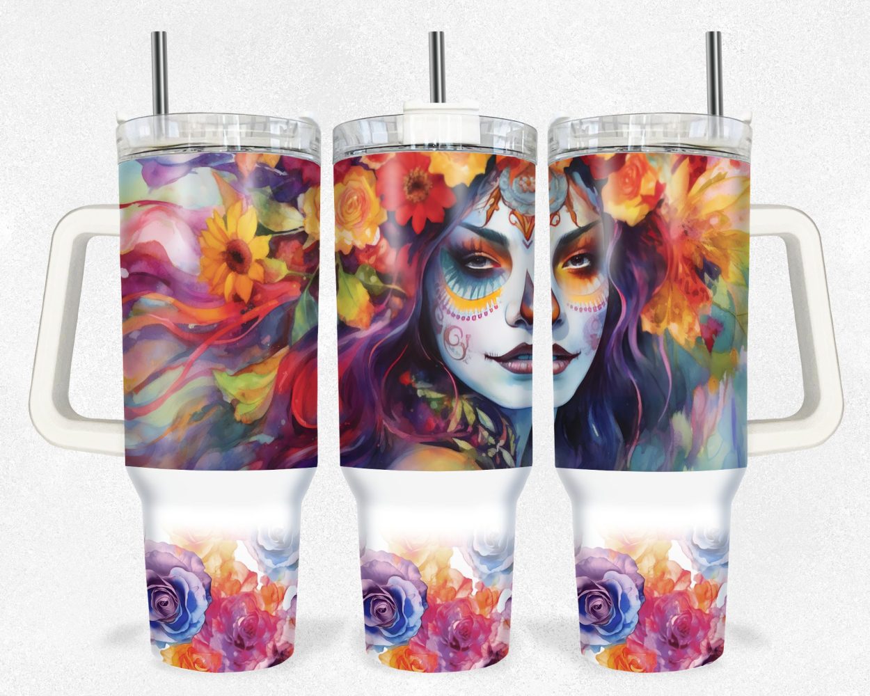 Floral Skulls Custom Stanley Quencher 40Oz Stainless Steel Tumbler With Handle