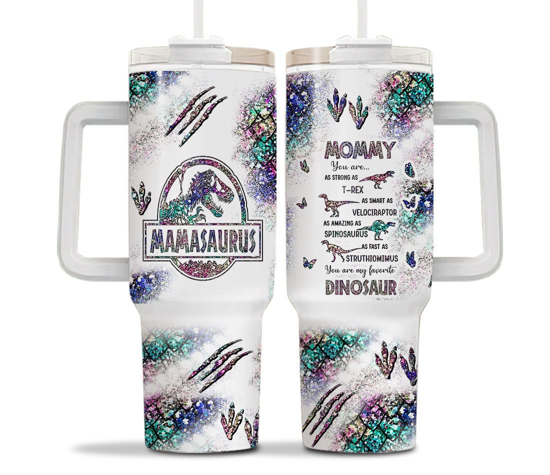 Glitter Mamasaurus Jurassic Park Movies Custom Stanley Quencher 40Oz Stainless Steel Tumbler With Handle
