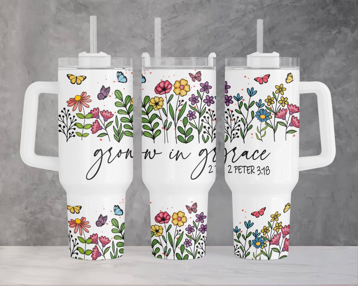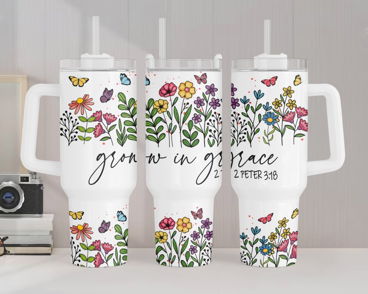 Grow In Grace Christian Faith Floral Custom Stanley Quencher 40Oz Stainless Steel Tumbler With Handle