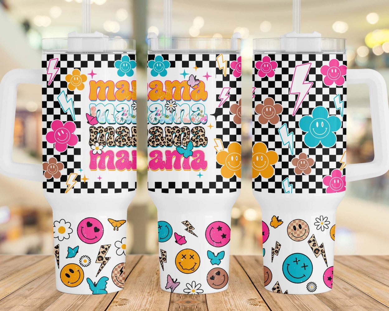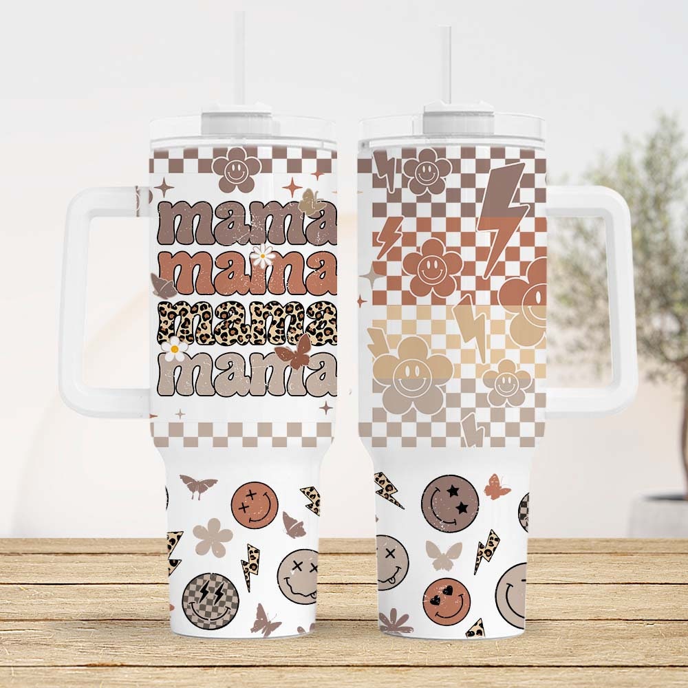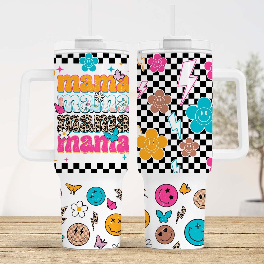 Mama Retro Checkered Smiley Face Custom Stanley Quencher 40Oz Stainless Steel Tumbler With Handle