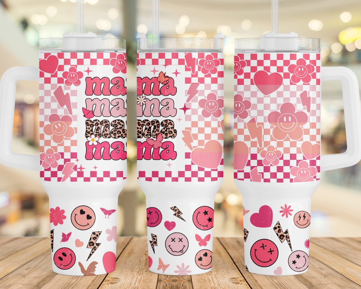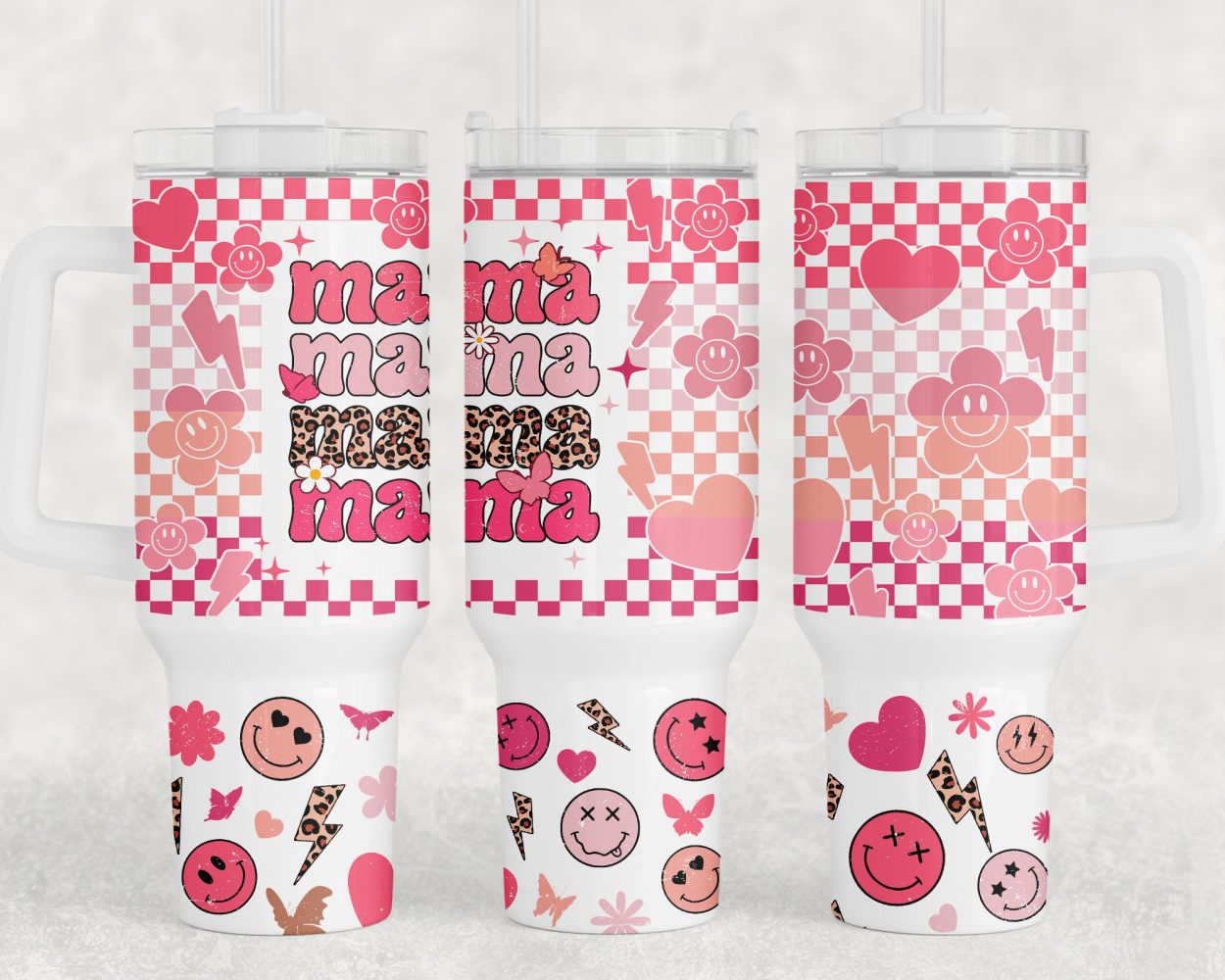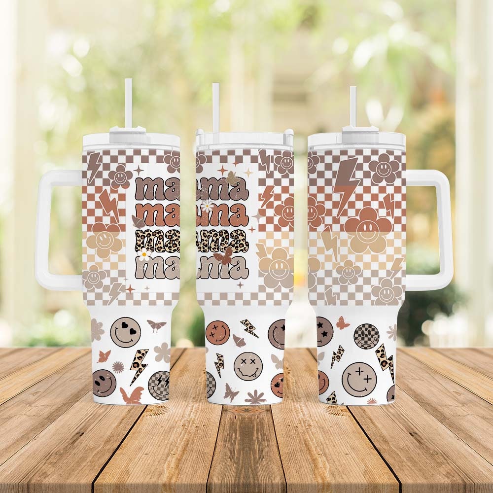 Mama Retro Checkered Smiley Face Custom Stanley Quencher 40Oz Stainless Steel Tumbler With Handle