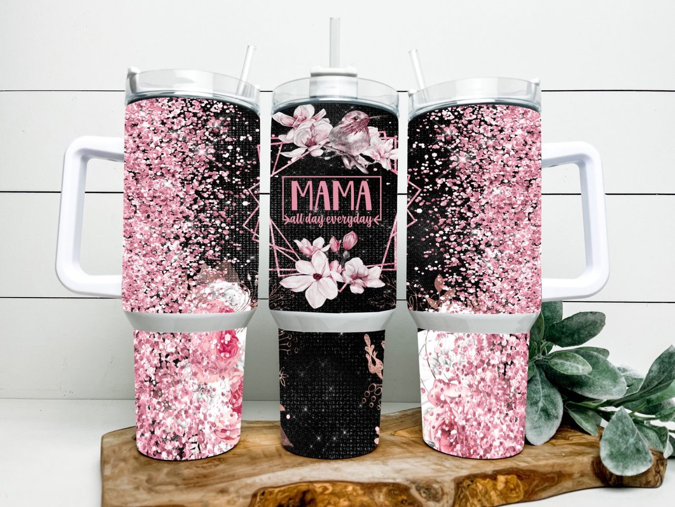 Mama Pink Floral Glitter Custom Stanley Quencher 40Oz Stainless Steel Tumbler With Handle