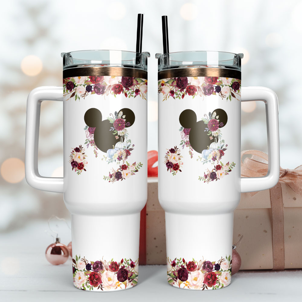 Mickey And Flower Art Custom Stanley Quencher 40Oz Stainless Steel Tumbler With Handle