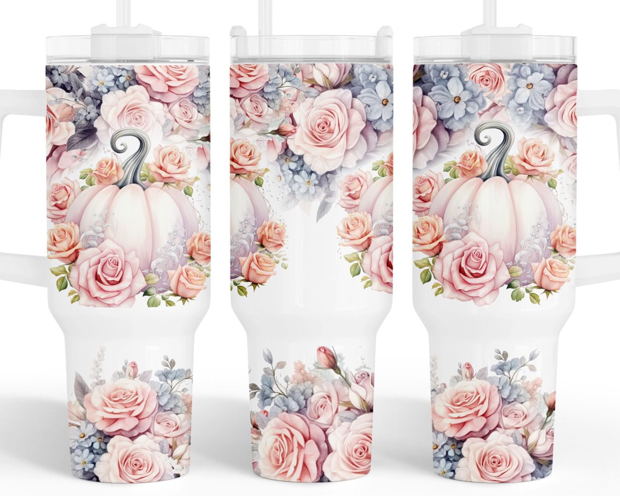 Pink Floral Pumpkin Custom Stanley Quencher 40Oz Stainless Steel Tumbler With Handle