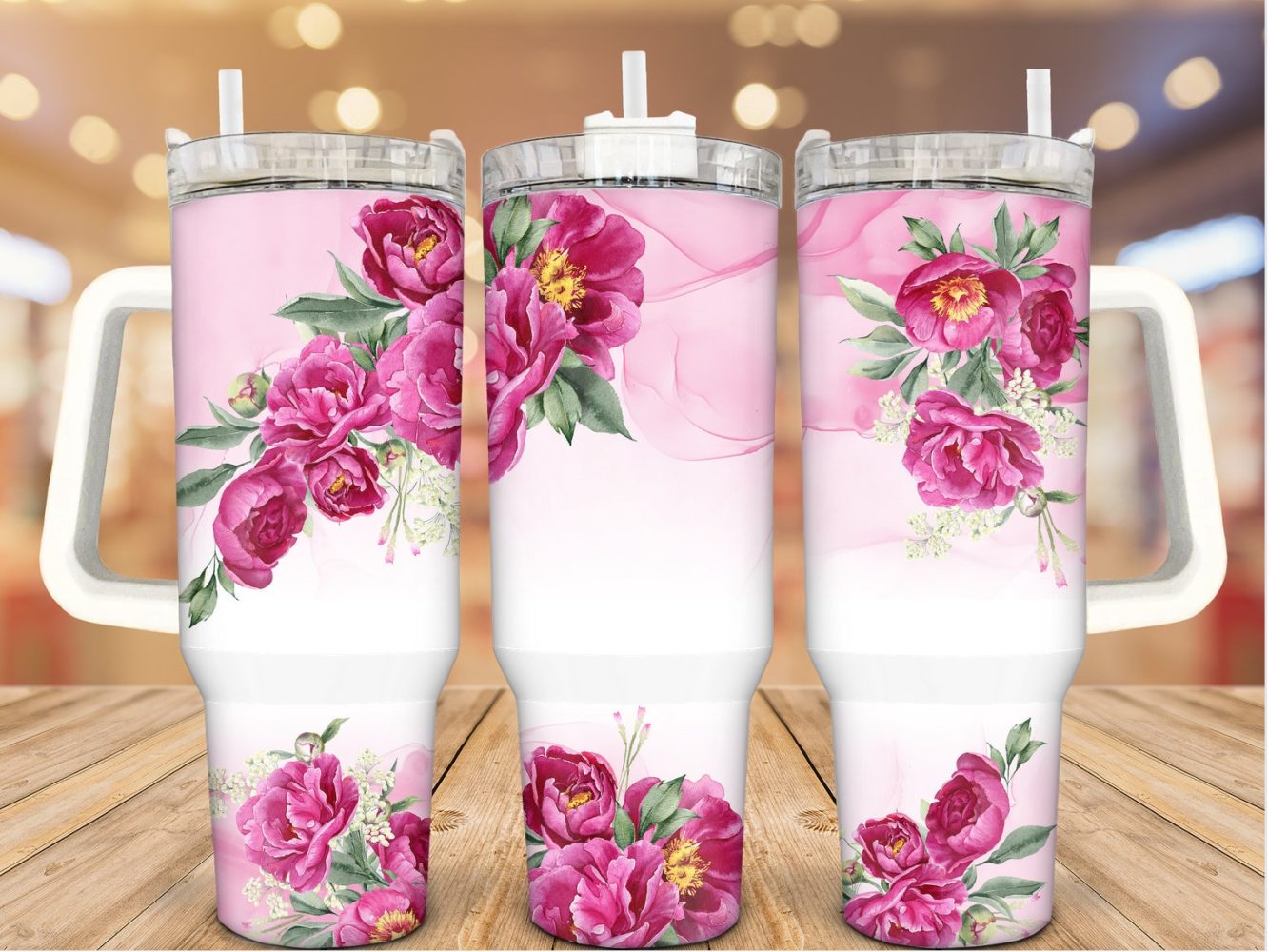 Pink Peony Custom Stanley Quencher 40Oz Stainless Steel Tumbler With Handle