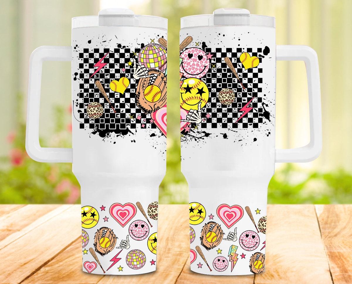 Softball Smiley Face Custom Stanley Quencher 40Oz Stainless Steel Tumbler With Handle