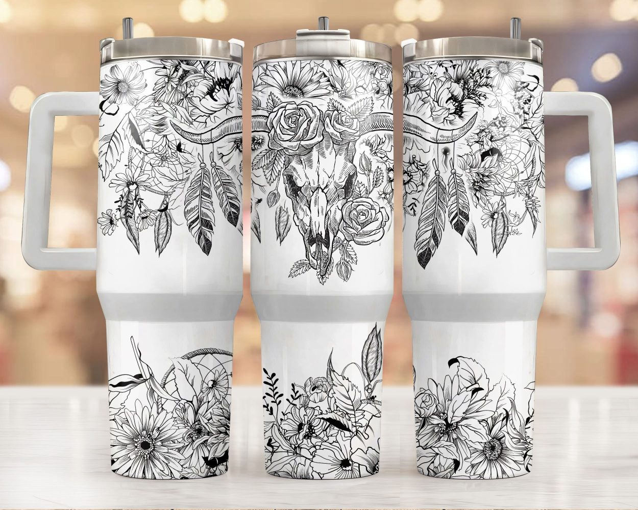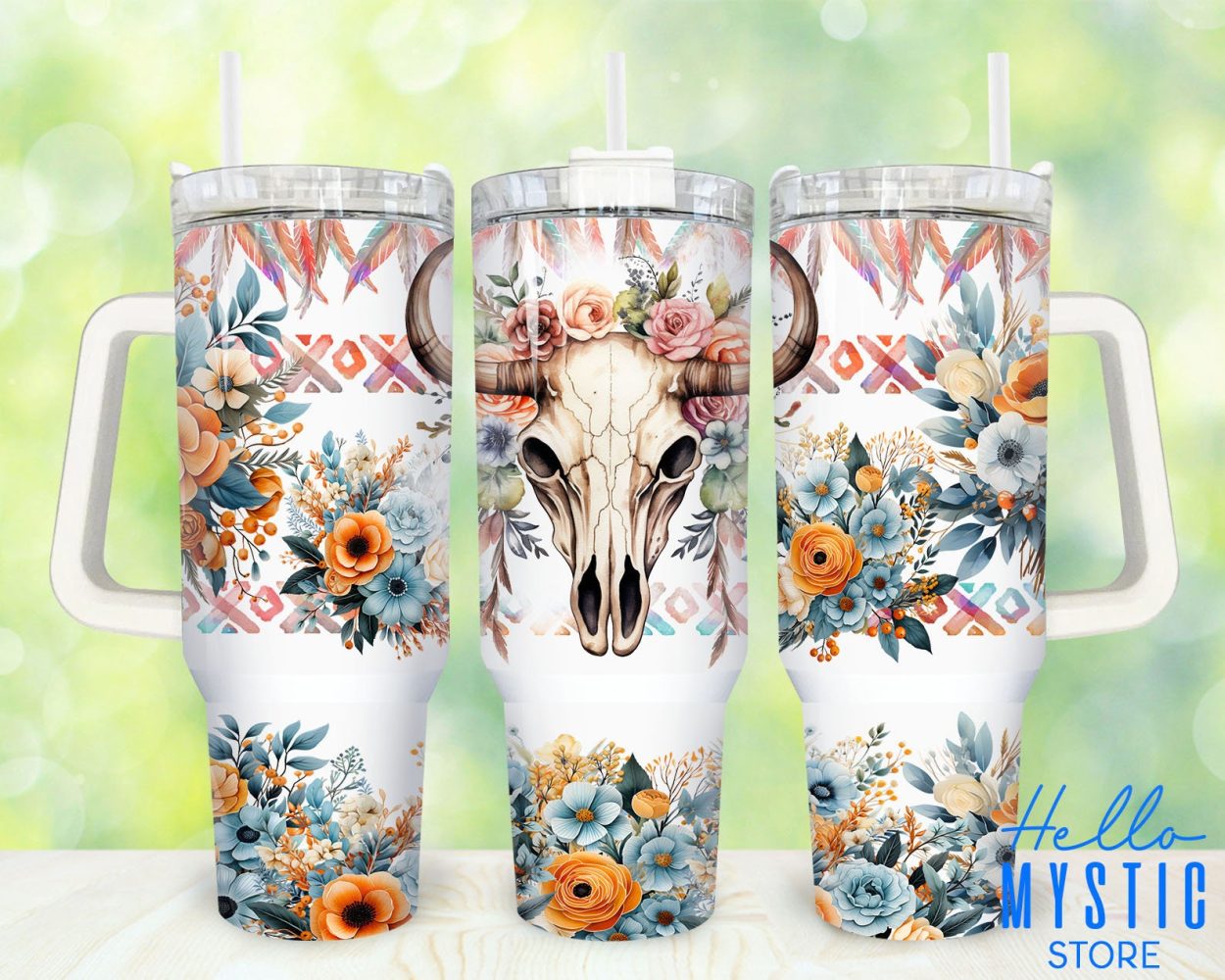 Boho Floral Bull Skull Custom Stanley Quencher 40Oz Stainless Steel Tumbler With Handle
