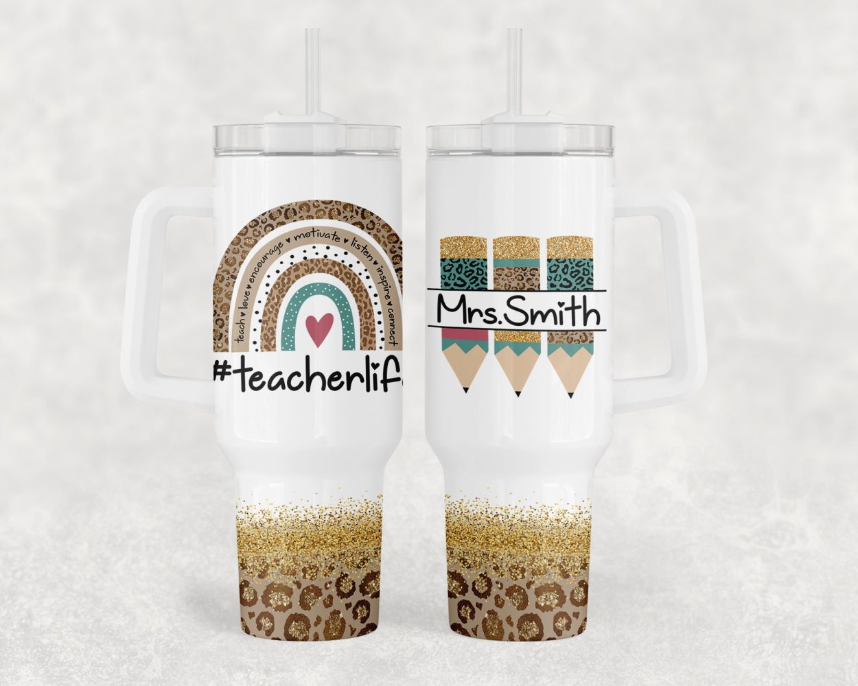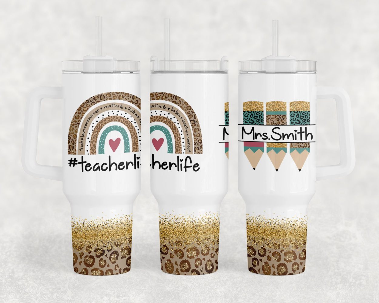 Teacher Life Leopard Print Custom Stanley Quencher 40Oz Stainless Steel Tumbler With Handle