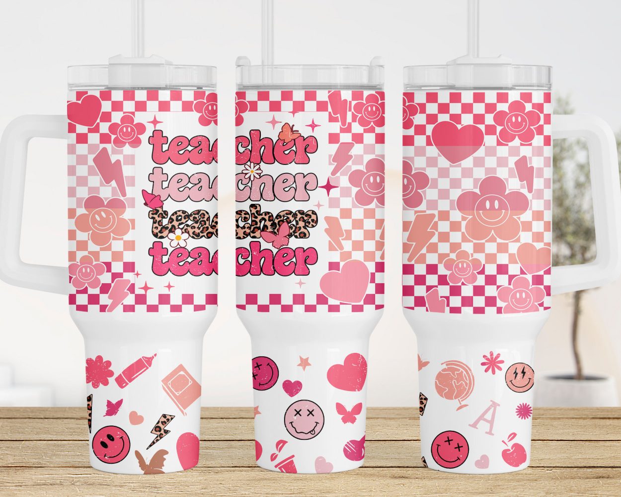 Teacher Retro Checkered Smiley Face Custom Stanley Quencher 40Oz Stainless Steel Tumbler With Handle
