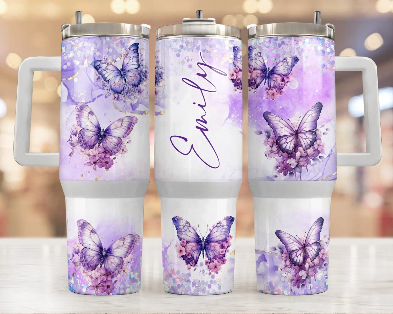 Butterfly Glitter Custom Stanley Quencher 40Oz Stainless Steel Tumbler With Handle