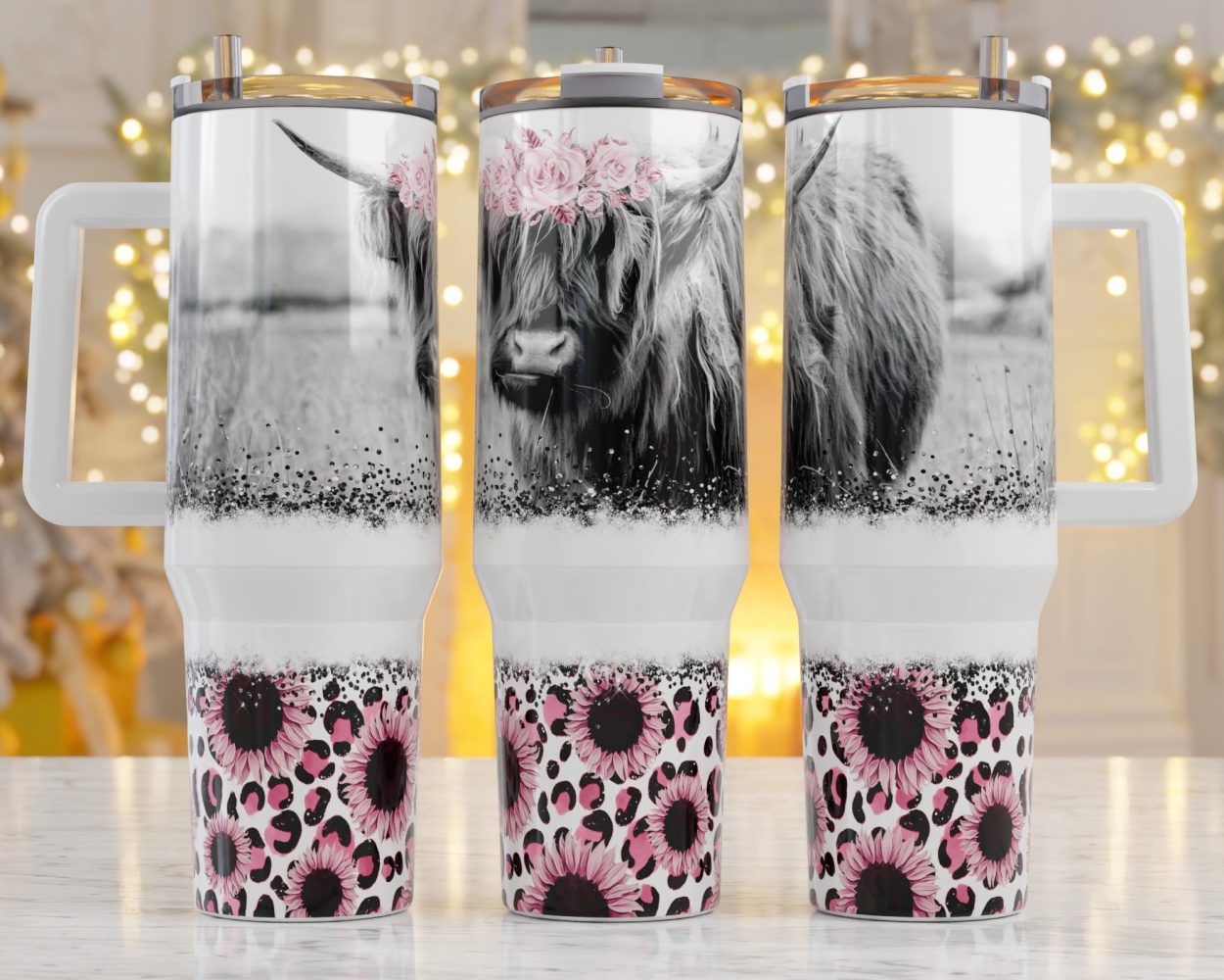 Cow With Pink Flowers Custom Stanley Quencher 40Oz Stainless Steel Tumbler With Handle
