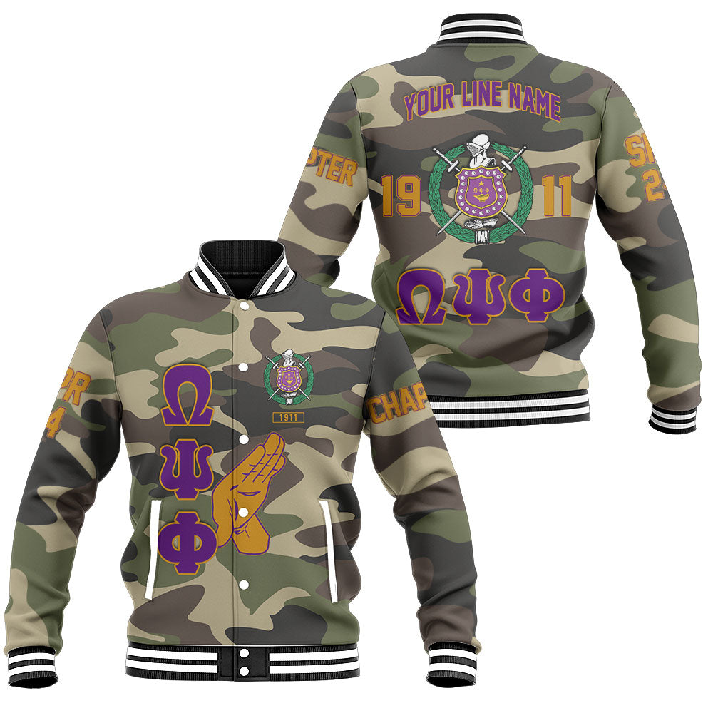 Personalized Omega Psi Phi Baseball Jackets Camouflage Handsign And Founded Year Style