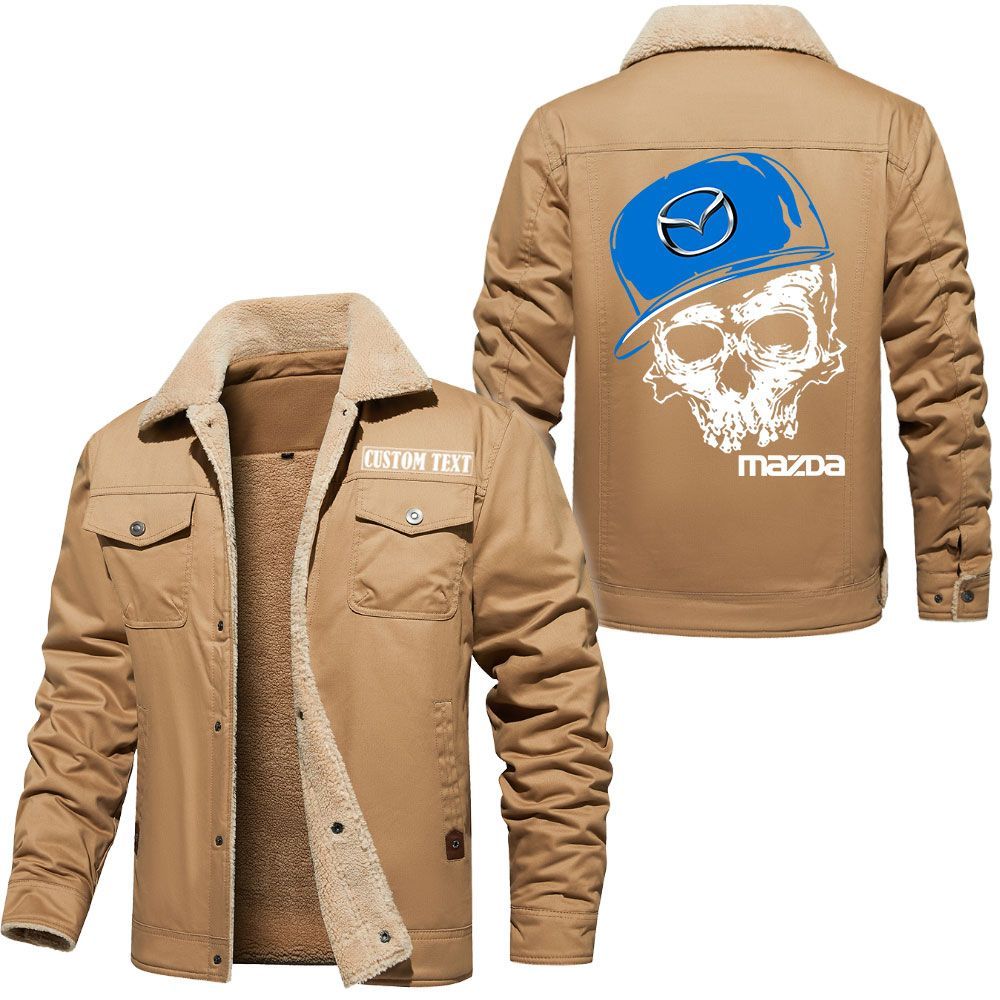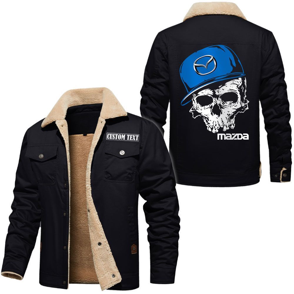 Mazda Logo Custom Name Cargo Fleece Lined Cotton Jacket Personalized Outerwear with Skull Design