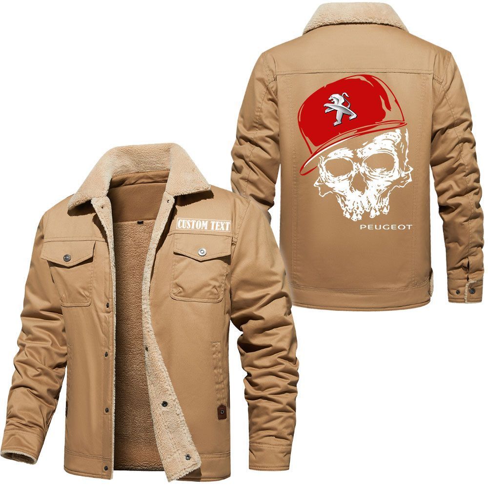 Peugeot Logo Custom Name Cargo Fleece Lined Cotton Jacket Personalized Outerwear with Skull Design