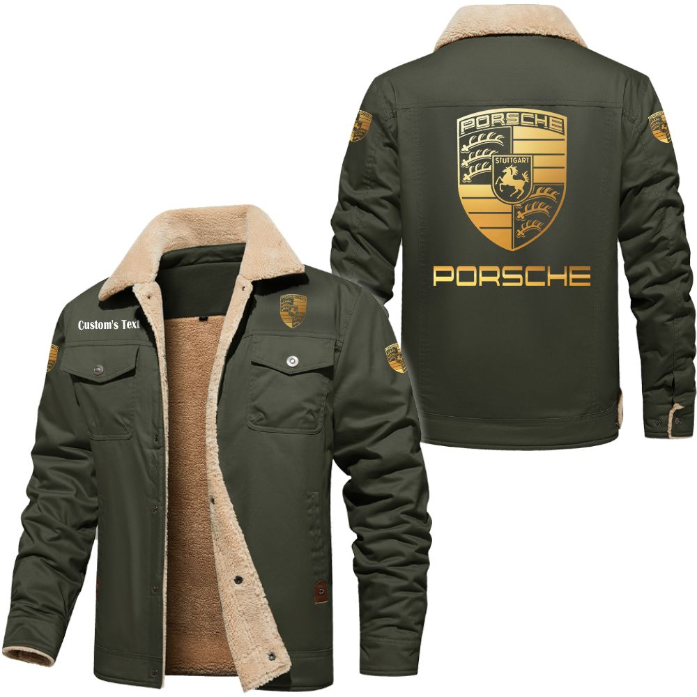 Porsche Golden Logo Custom Cargo Fleece Lined Cotton Jacket Army Green