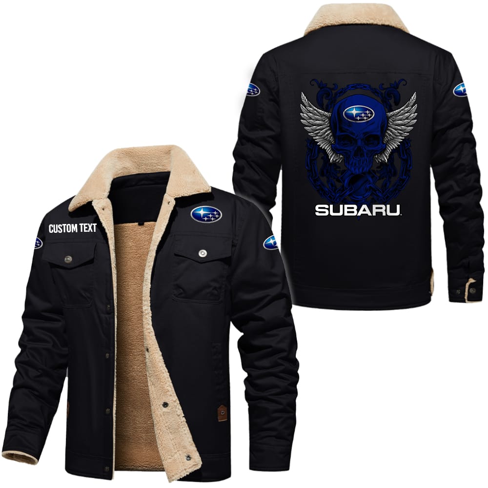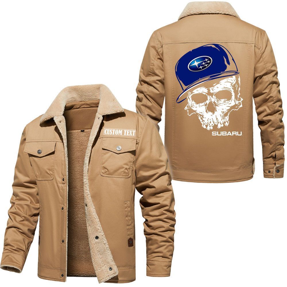 Subaru Logo Custom Name Cargo Fleece Lined Cotton Jacket Personalized Outerwear with Skull Design