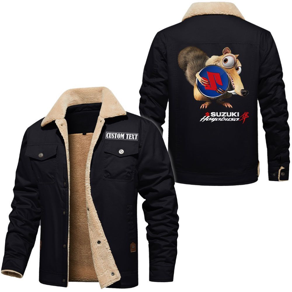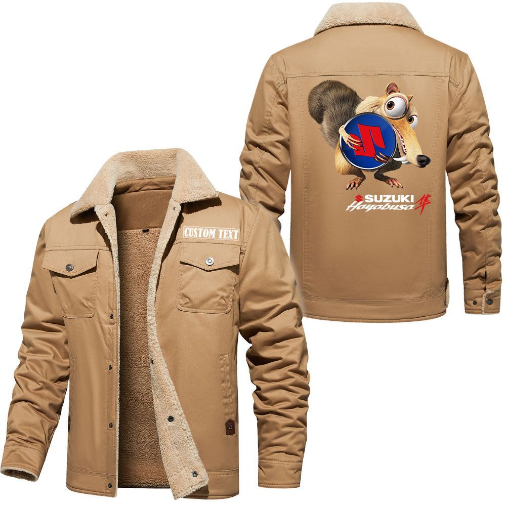 Suzuki Hayabusa Logo Custom Name Cargo Fleece Lined Cotton Jacket Scrat Ice Age Design Personalized Outerwear