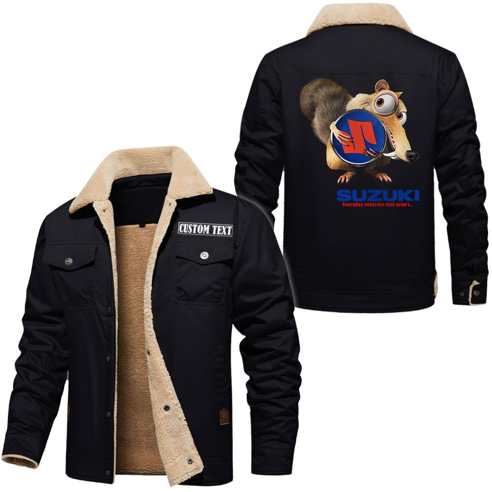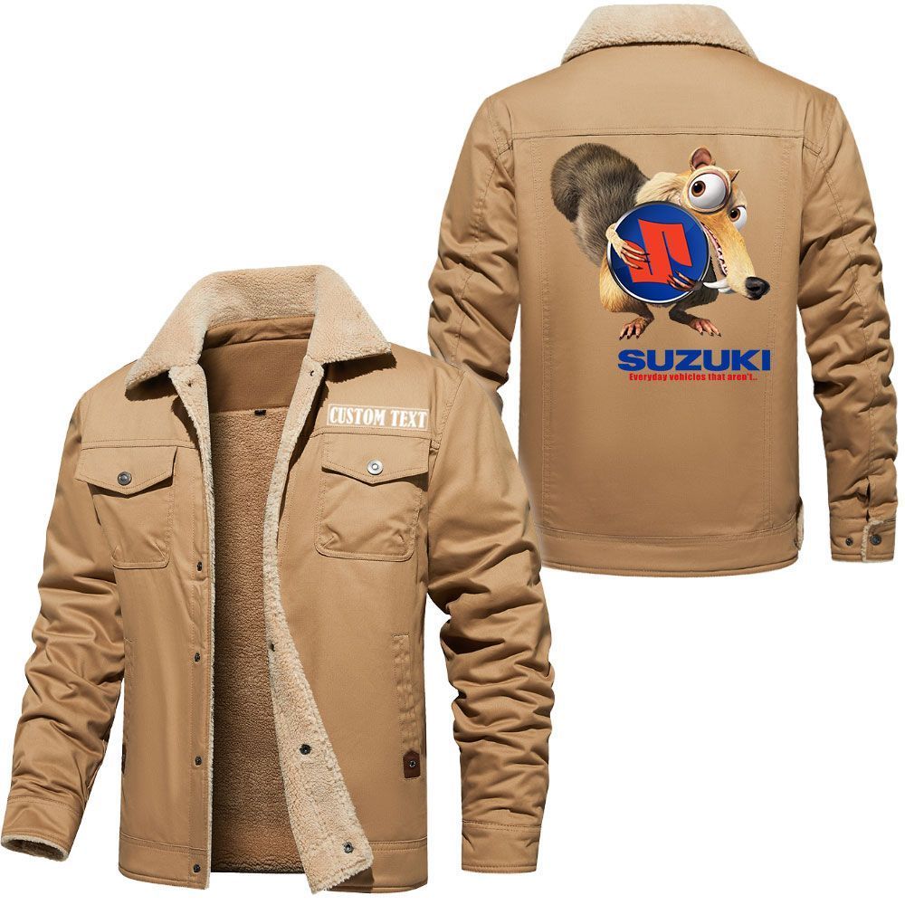 Suzuki Logo Custom Name Cargo Fleece Lined Cotton Jacket Scrat Ice Age Design Personalized Outerwear
