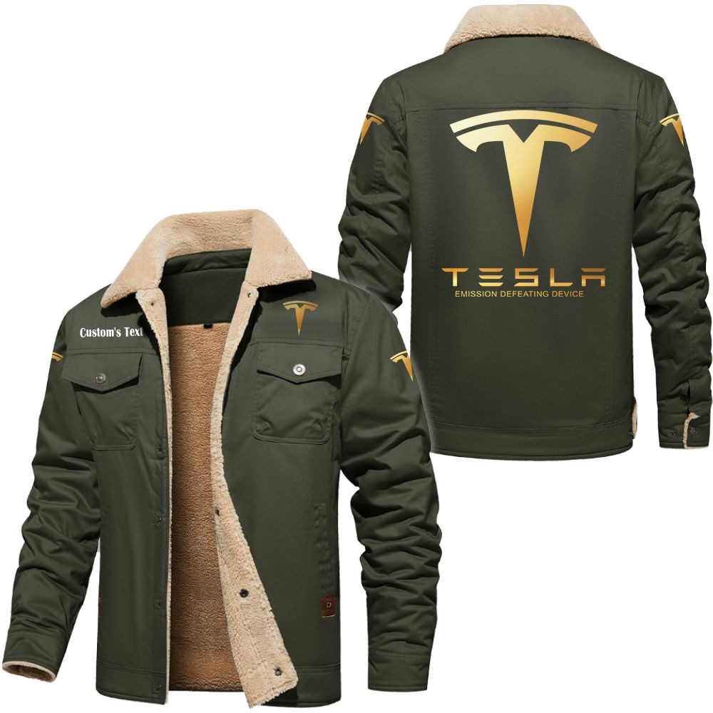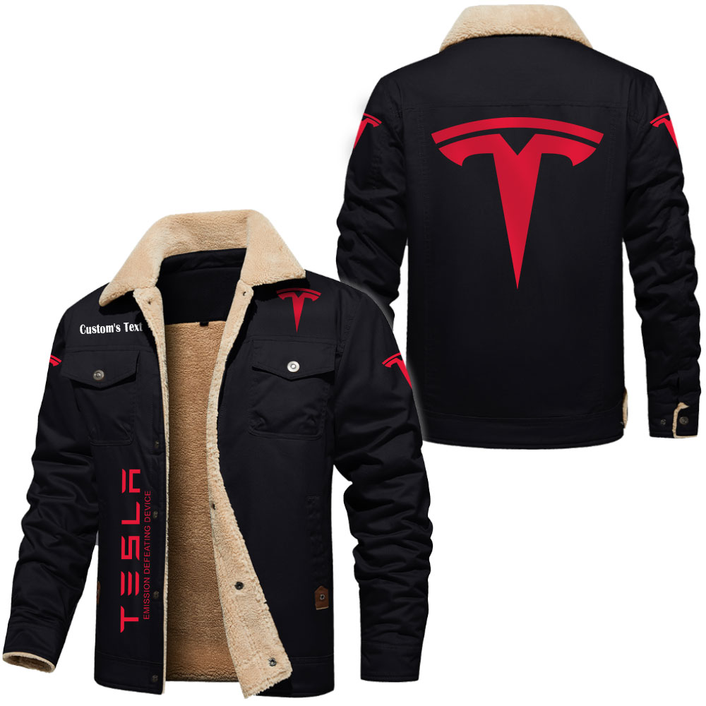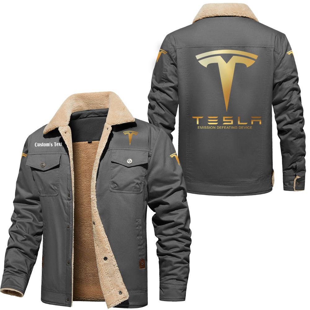 Tesla Motors Emission Defeating Device Logo Custom Text Cargo Fleece Lined Cotton Jacket