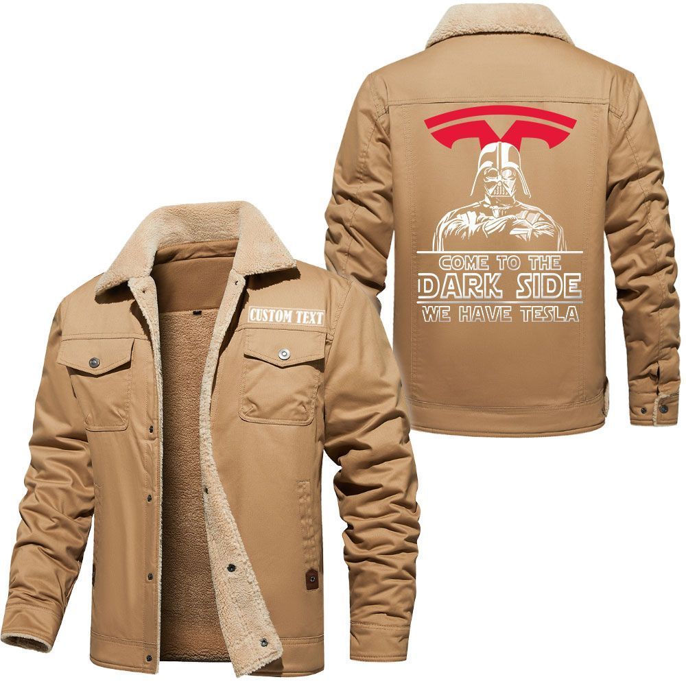 Tesla Motors Logo Custom Name Cargo Fleece Lined Cotton Jacket Personalized Outerwear with Dark Side Star Wars Design