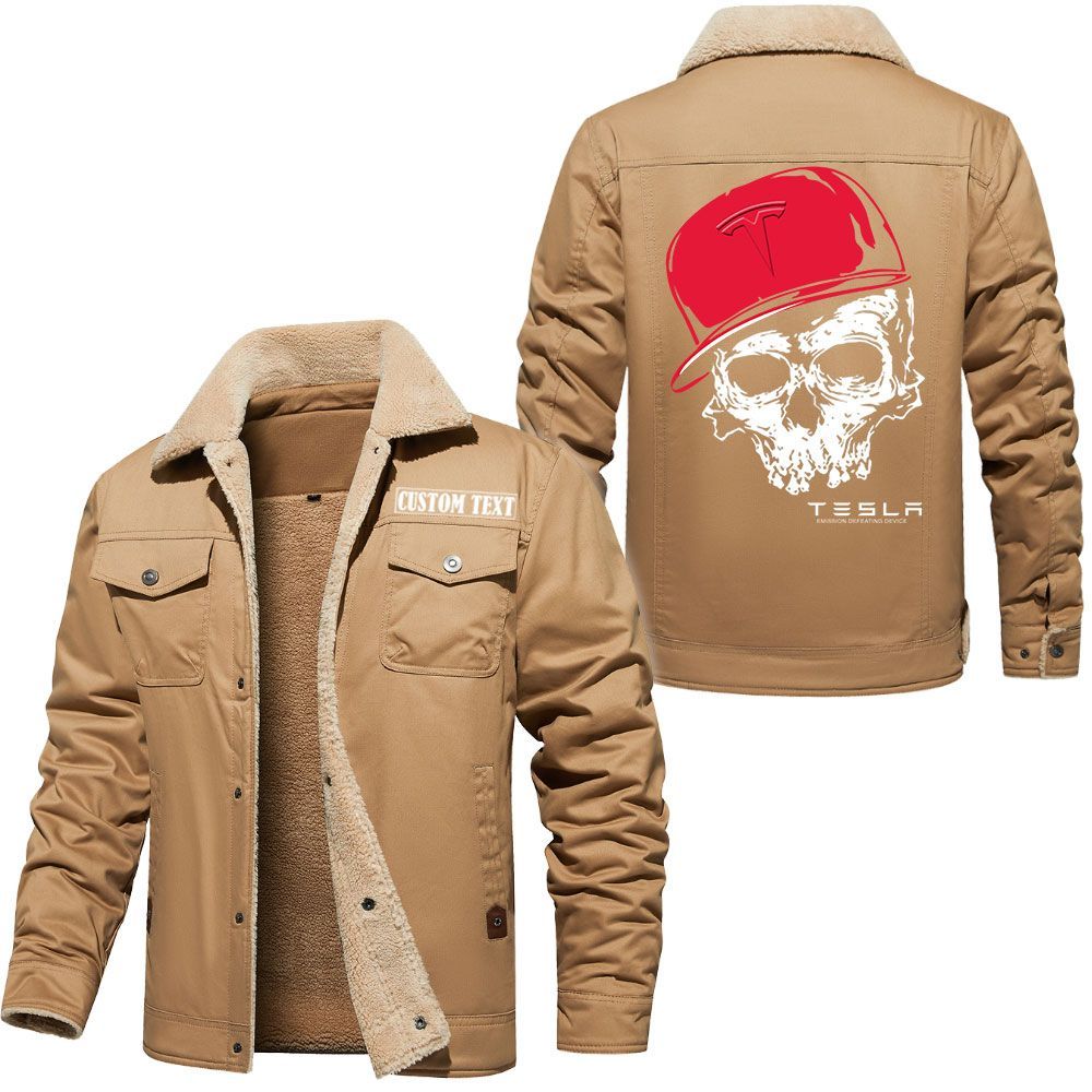 Tesla Motors Logo Custom Name Cargo Fleece Lined Cotton Jacket Personalized Outerwear with Skull Design