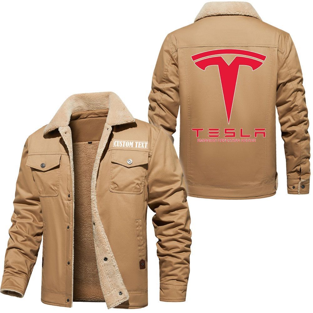 Tesla Motors Logo Custom Name Cargo Fleece Lined Cotton Jacket Stylish Warm Personalized Outerwear