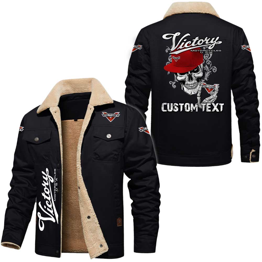 Victory Motorcycles Logo Custom Name Cargo Fleece Lined Cotton Jacket Personalized Outerwear with Skull Design