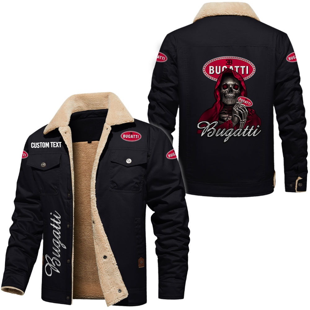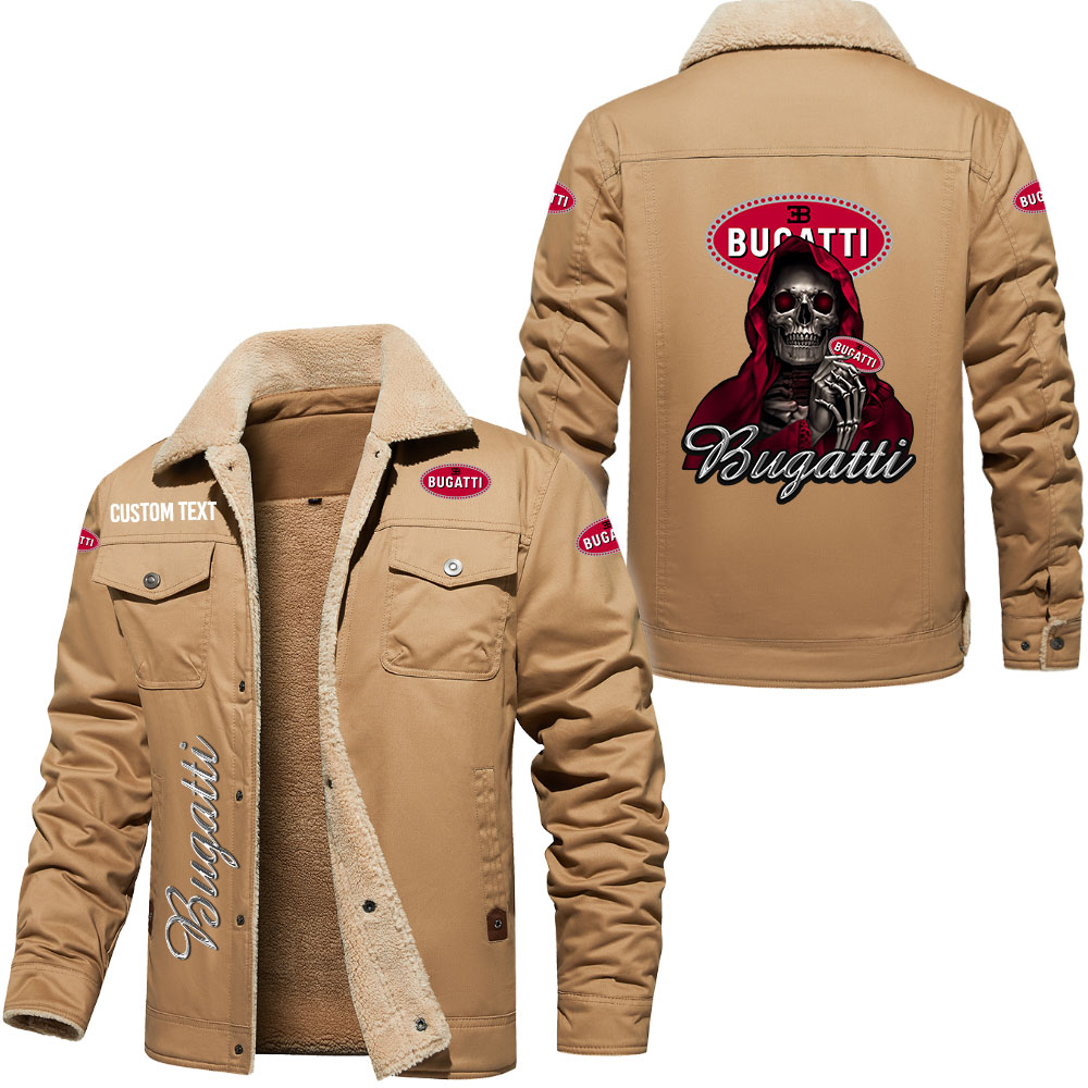 Bugatti Logo Custom Name Cargo Fleece Lined Cotton Jacket Personalized Outerwear with Skull Design