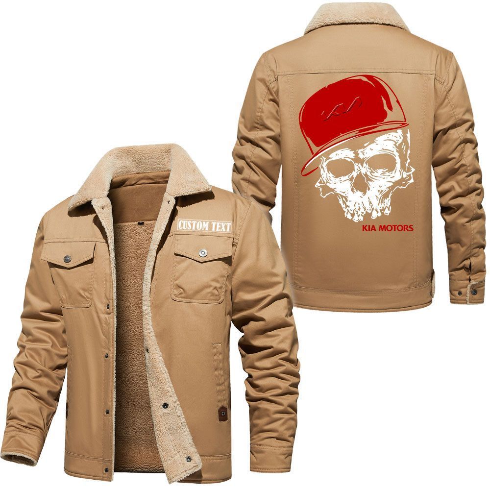 Kia Logo Custom Name Cargo Fleece Lined Cotton Jacket Personalized Outerwear with Skull Design