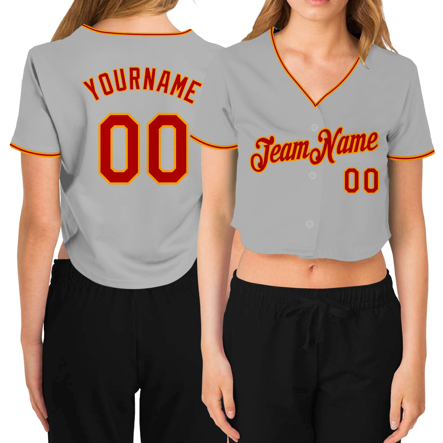 CustomGray Red-Gold V-Neck Cropped Women Baseball Jersey