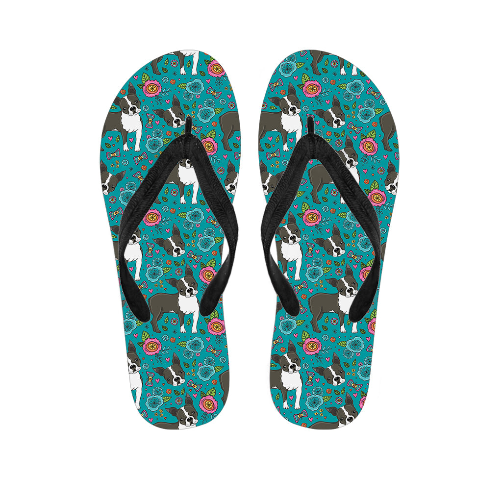 Cartoon Boston Terrier Flower Print Flip Flops For Men Women