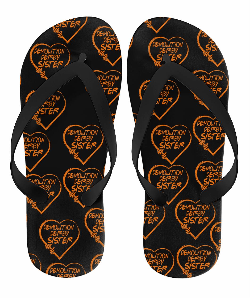 Demolition Derby Wife Heart Flip Flops Black Strap Orange