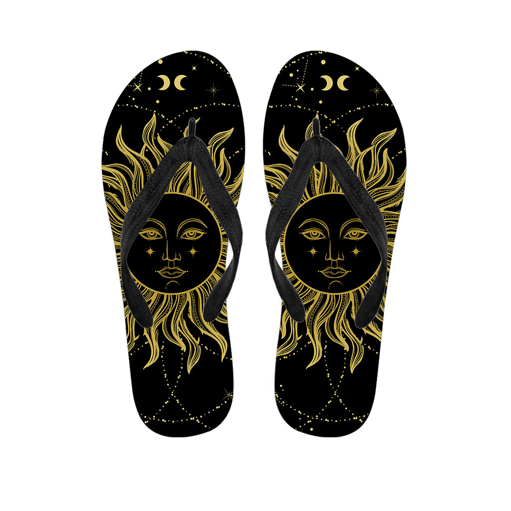 Black And Gold Celestial Sun Print Flip Flops For Men Women