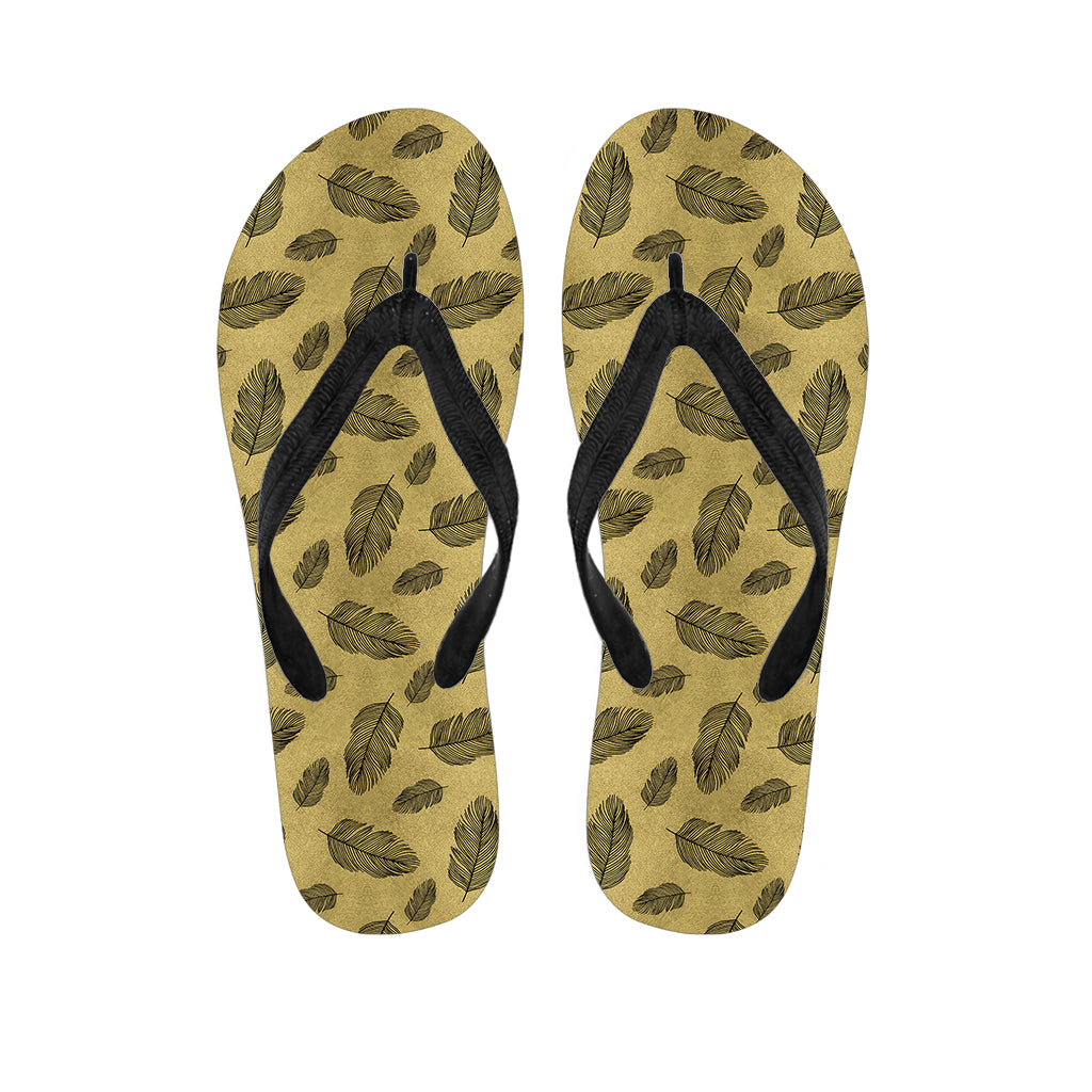 Black And Gold Feather Pattern Print Flip Flops For Men Women
