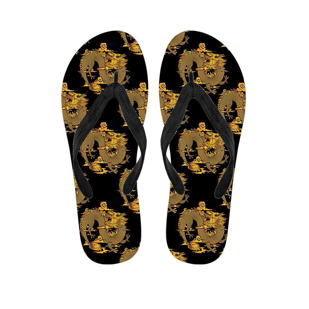 Black And Gold Dragon Pattern Print Flip Flops For Men Women