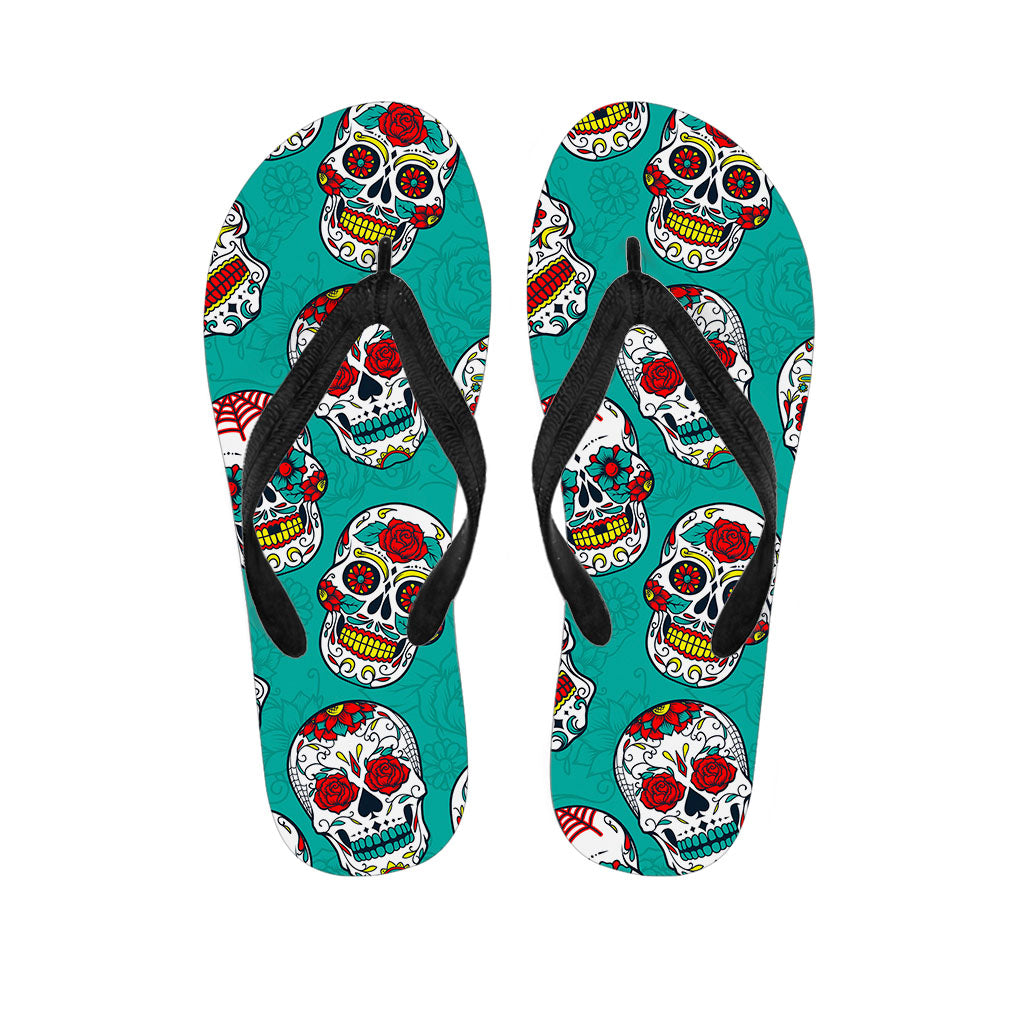 Teal Sugar Skull Pattern Print Flip Flops For Men Women