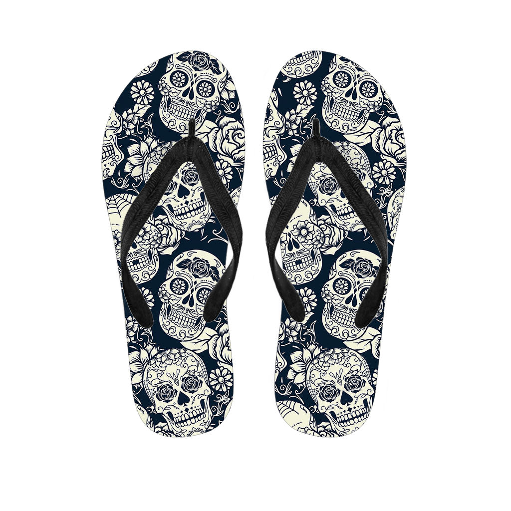 White Floral Sugar Skull Pattern Print Flip Flops For Men Women