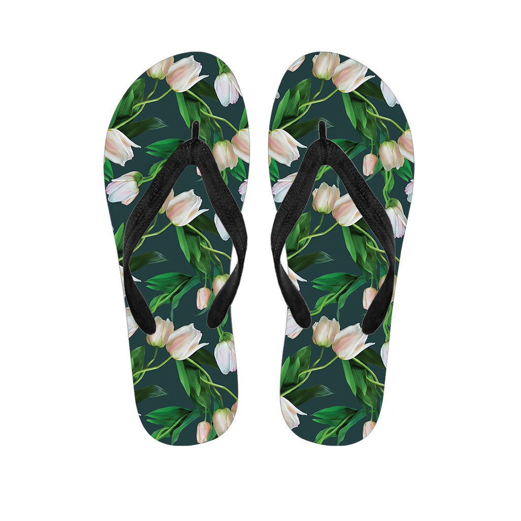 White Tulip Pattern Print Flip Flops For Men Women
