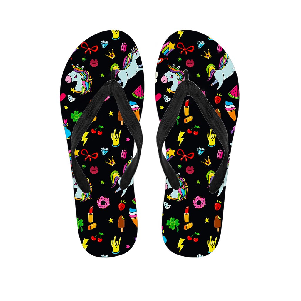 Black Girly Unicorn Pattern Print Flip Flops For Men Women