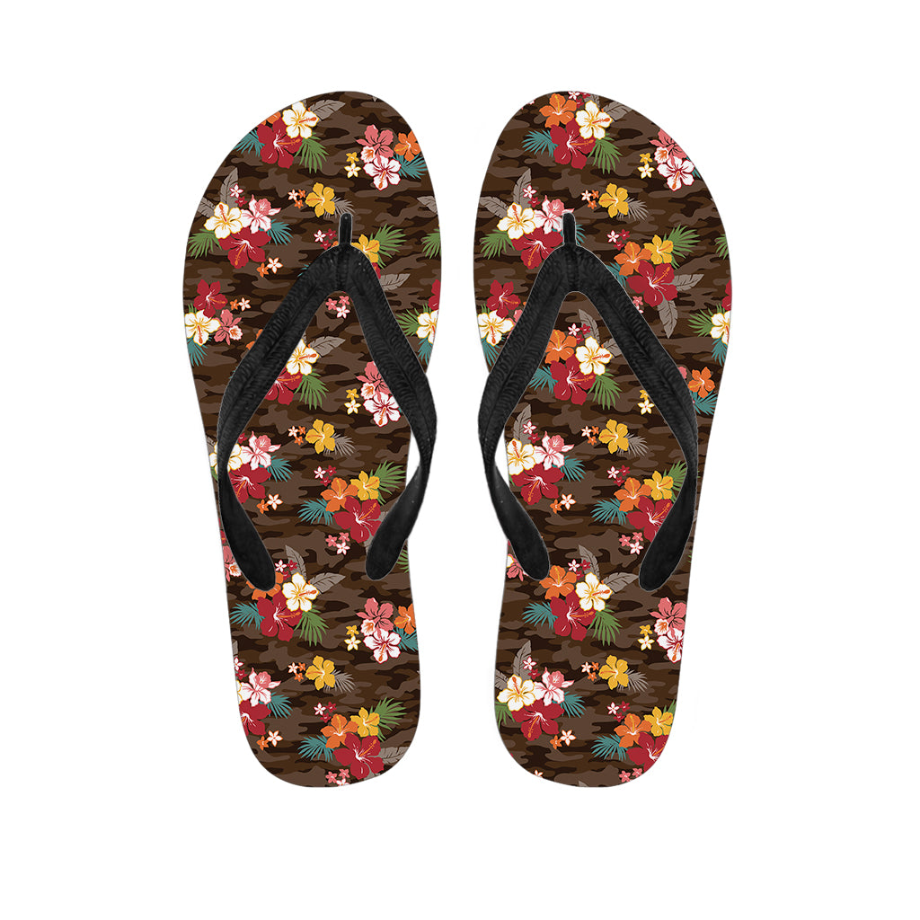 Brown Camo Hibiscus Flower Print Flip Flops For Men Women